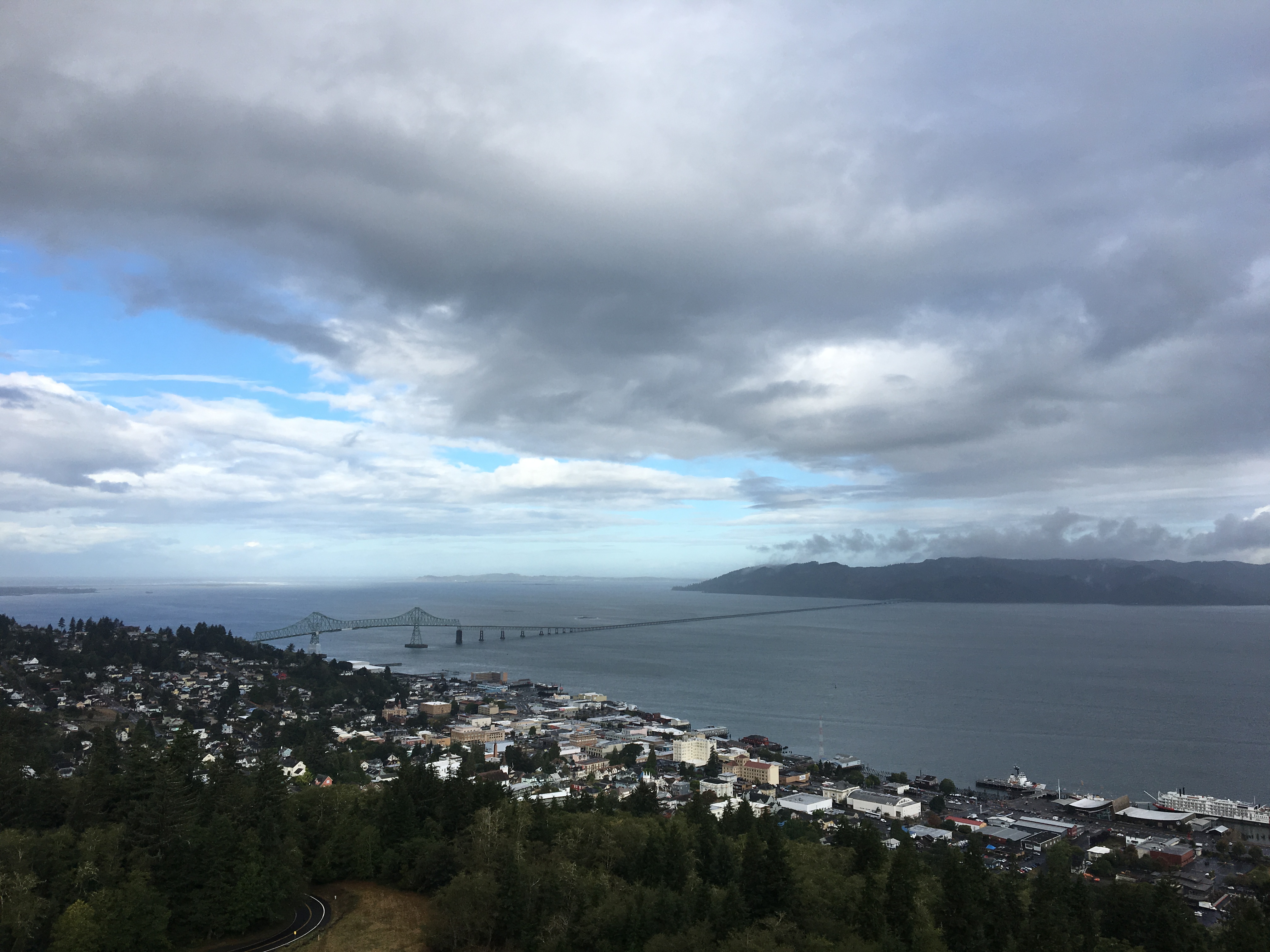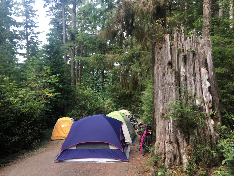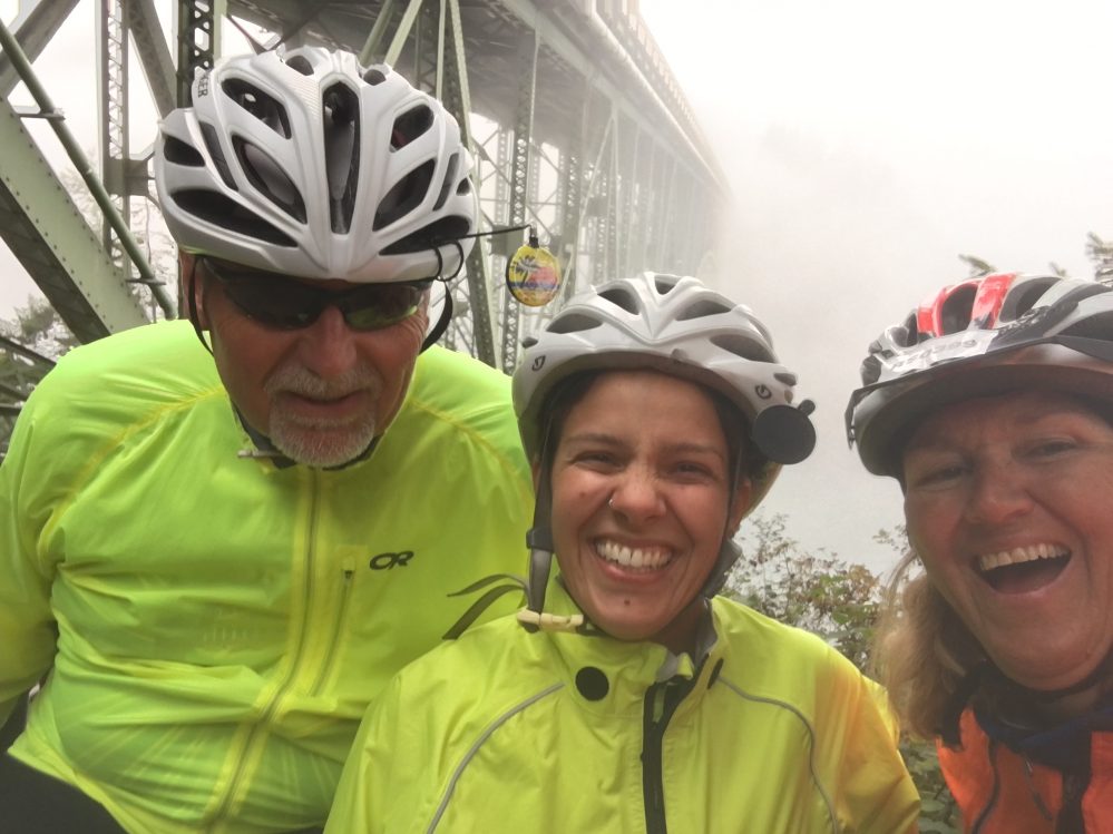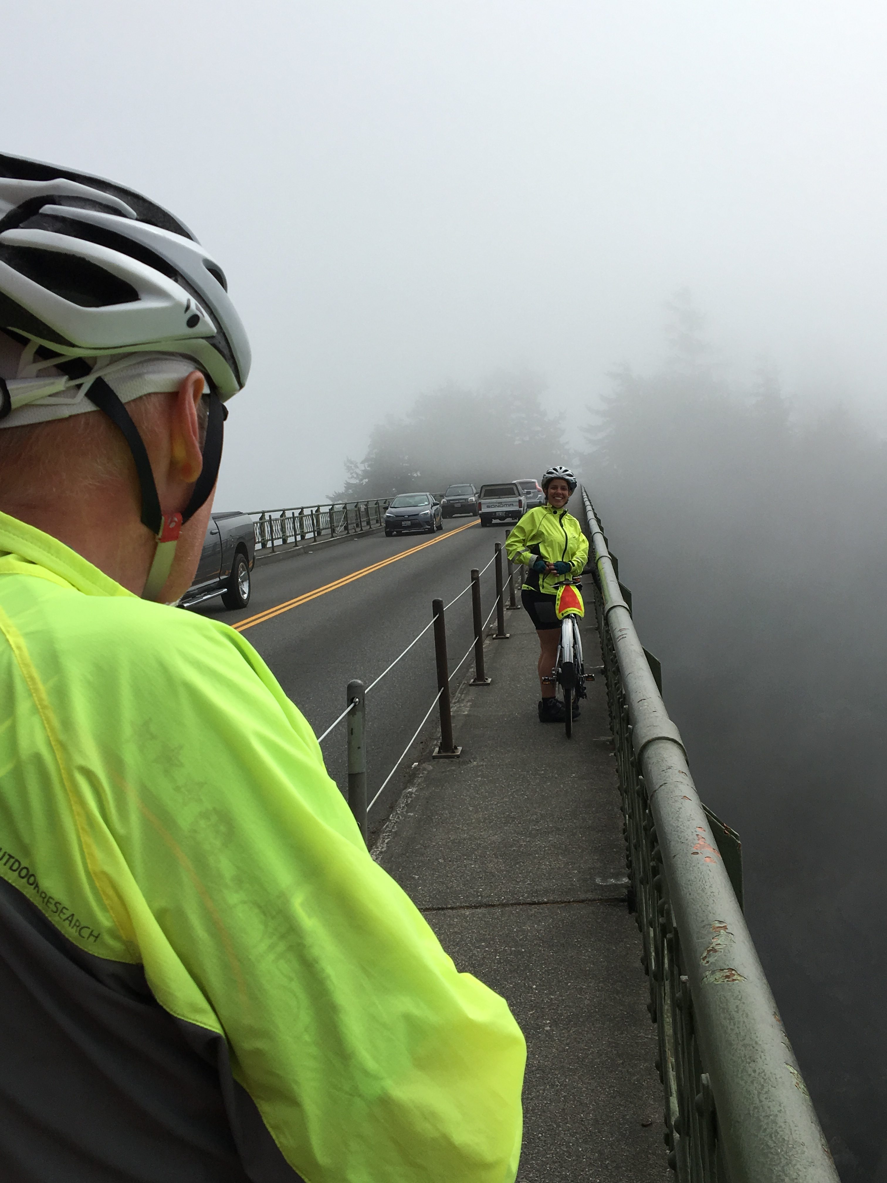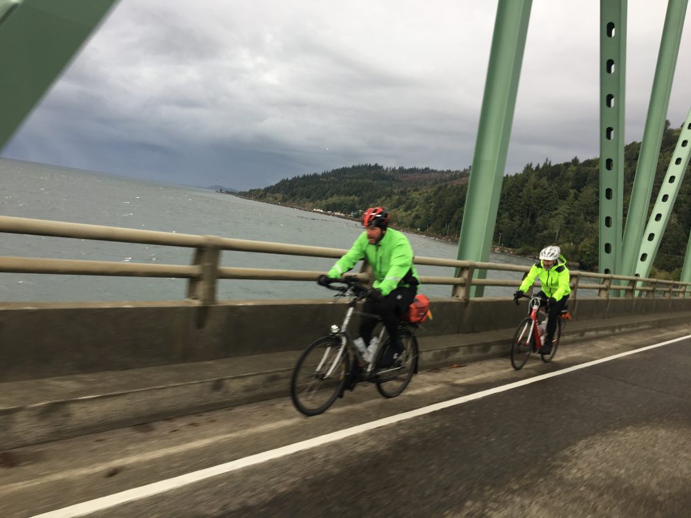 Today we woke to rain again but looked at forecast and it was supposed to stop around 11 so some of us decided to have extra coffee or tea and wait it out . It was a good decision. Around 10:30 we left and it had stopped raining and it was a nice ride under the Astoria bridge and around the Pennisula of Astoria heading across Young Bay toward Seaside. The villages have either very small cottages or very lavish homes. We stopped in Cannon Beach see the Sea stacks and had lunch. Then we stayed along the coast highway going up and down the hills to the next seaports. There were some good hills but it was quite rewarding at the top. We reached our camp around 5ish and had a nicely prepared salmon and pasta dinner followed by s’mores which we made ourselves. Our campsite is near the ocean and we can hear the surf which is very soothing although it is quite chilly. I did receive my other sleeping bag in the mail from Paul so I will see if this one works!
