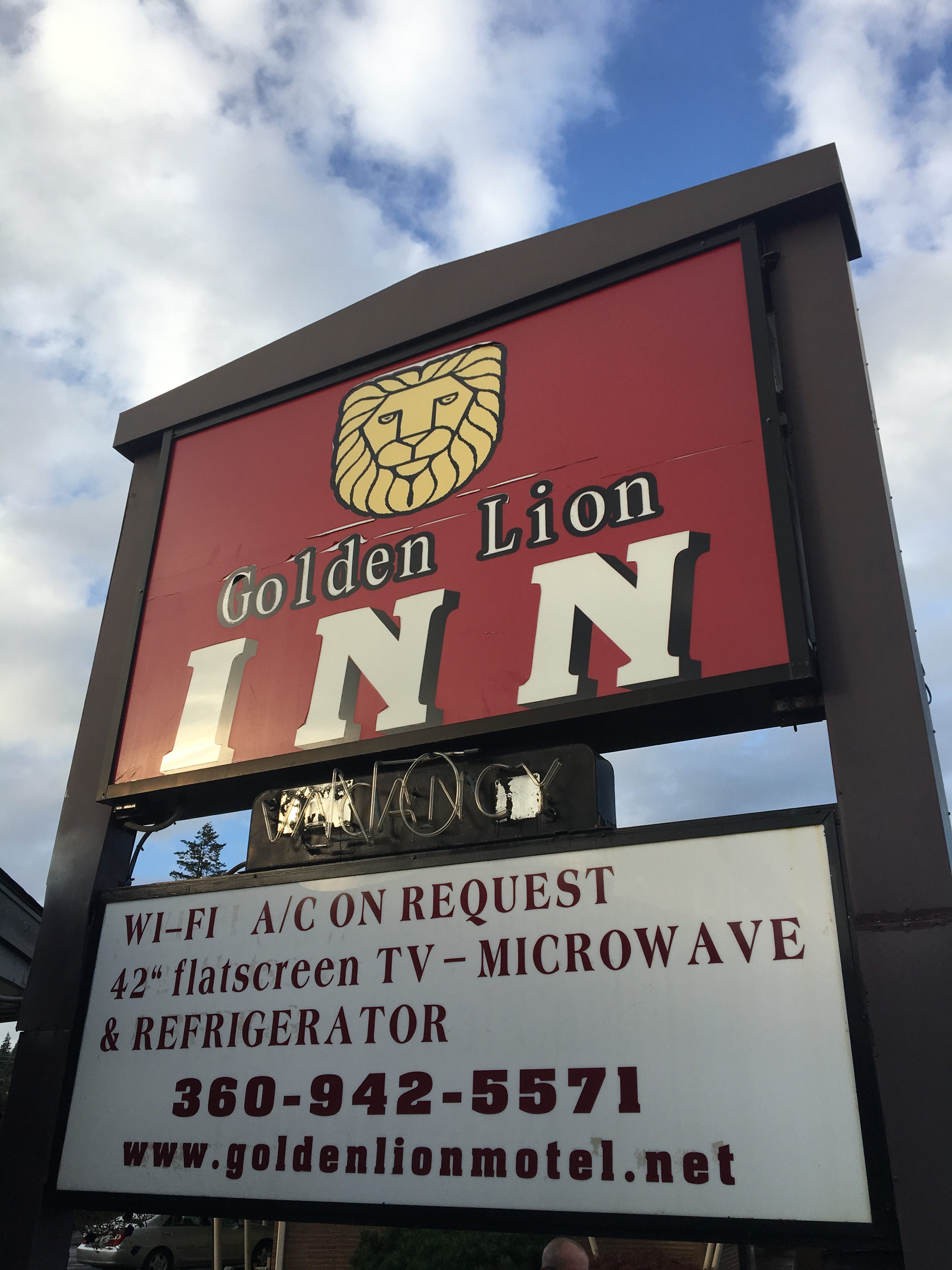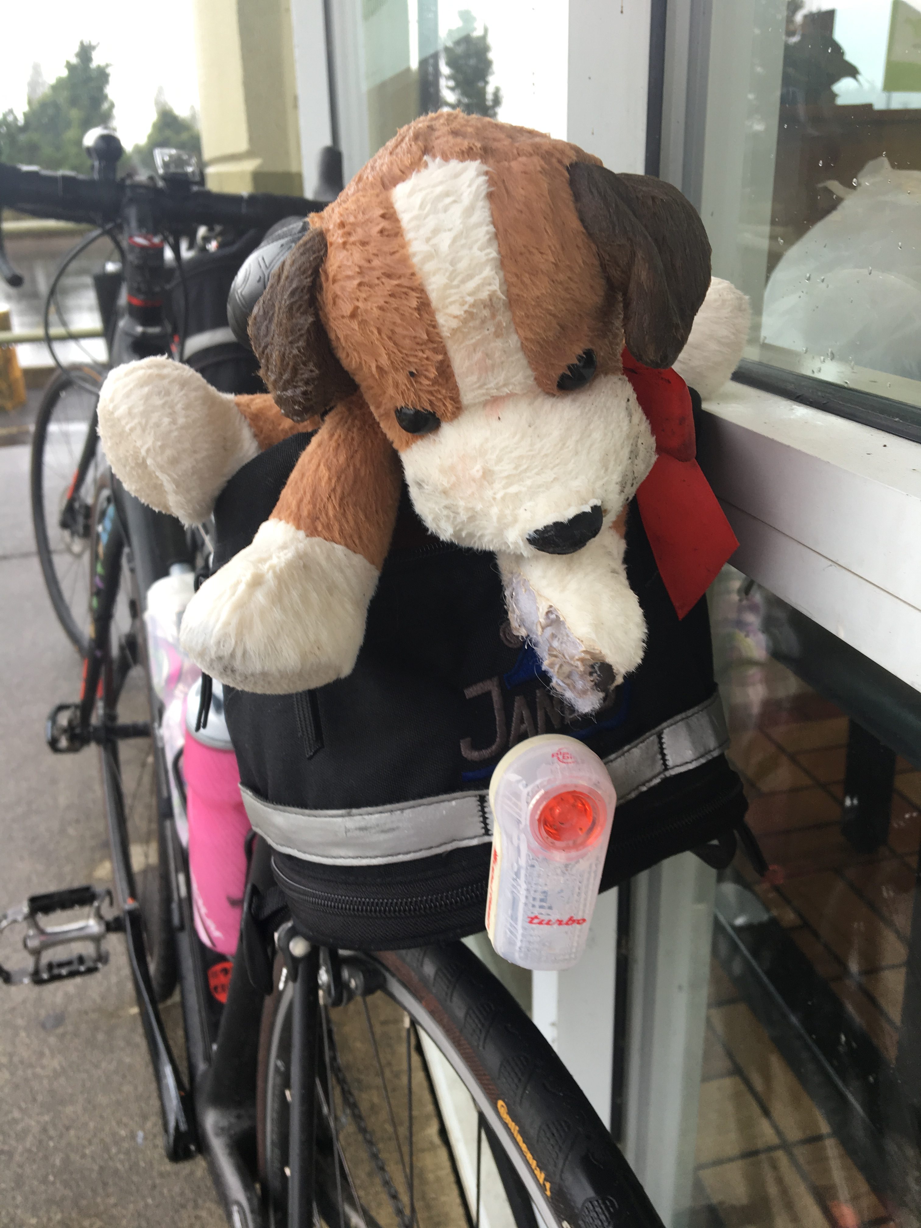 Today we knew it was going to rain so Mark and I pulled out early. I found Mr Jingles along the way. It was going to rain so I figured he needed shelter. We made it about 30 miles when it started to sprinkle and by the time we made it to Howuim it was pouring and chilly. We were trying to figure out directions at a bus stop shelter and low and behold a bus came by and stopped. We asked where he was going and he said Aberdeen and that was not our destination but it was closer, so we said great and put our bikes on the bus bike rack in front of the bus and got on. He drove us to the far end of Aberdeen and dropped us off at Walmart. Knowing it was going to keep raining we looked up hotel rooms in Raymond. We chose Golden Lion and Mark asked if there was s way to get to the hotel which was still 25 miles away and the owner Bob said he was coming to Walmart and he would pick us up!! Not only did he pick us up but on the way he picked up Ann who was going to be my roommate. So today I am very grateful !