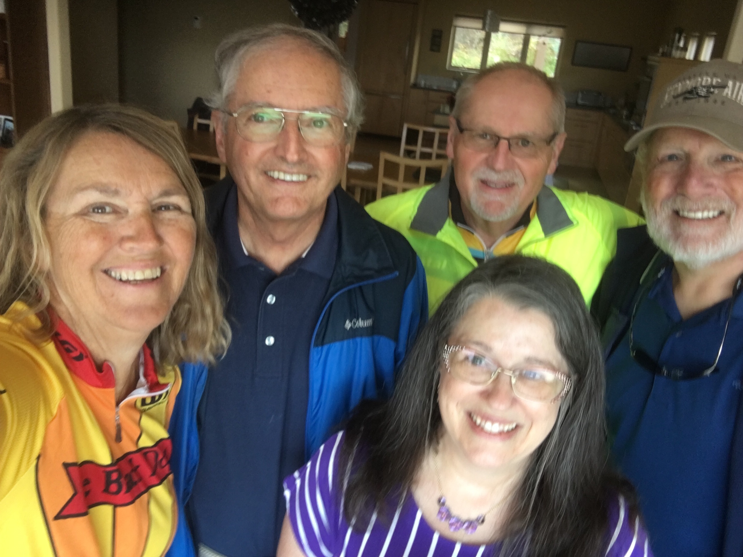 Today we left Bob and Susan’s beautiful house in Anacortes and biked up to Bellingham after Bob gave us a ride up over the Big bridge.! It’s funny how the bridge only has a bike lane on one side !?! The road was hilly but had beautiful views of mountains in the distance including Mt Baker. We passed through small towns and men fishing in the river for salmon. We actually were on the MS bike route and there were lots of bikers on the road. We stopped st the Oyster. Bar along the way and met Paul for soup and salad. Delicious. Paul met us at the campground and dropped off our stuff and he then headed back to Seattle and then home. Mark and I set up our tents, met everyone and had a great dinner.